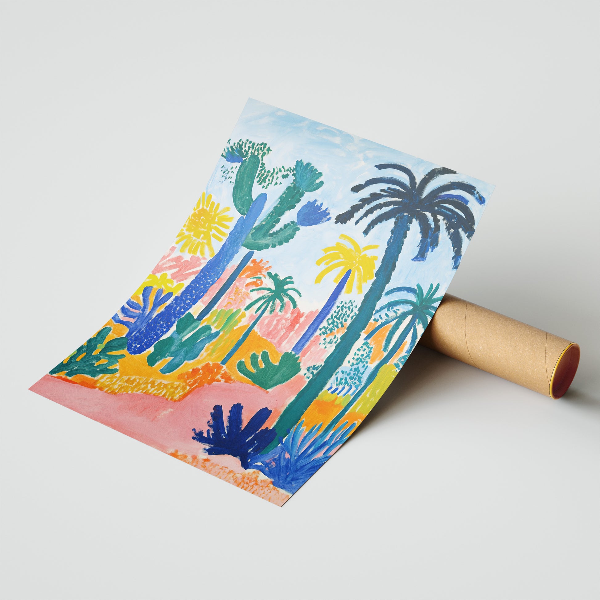 Transport yourself to a vibrant "Tropical Oasis - Palm and Cactus." This Post-Impressionist poster features a colorful and stylized desert scene, where majestic palms and unique cacti thrive under a bright sky. The bold shapes and dynamic colors create a sense of exotic adventure and natural splendor, perfect for bringing a warm, artistic, and distinctive touch to your home decor.