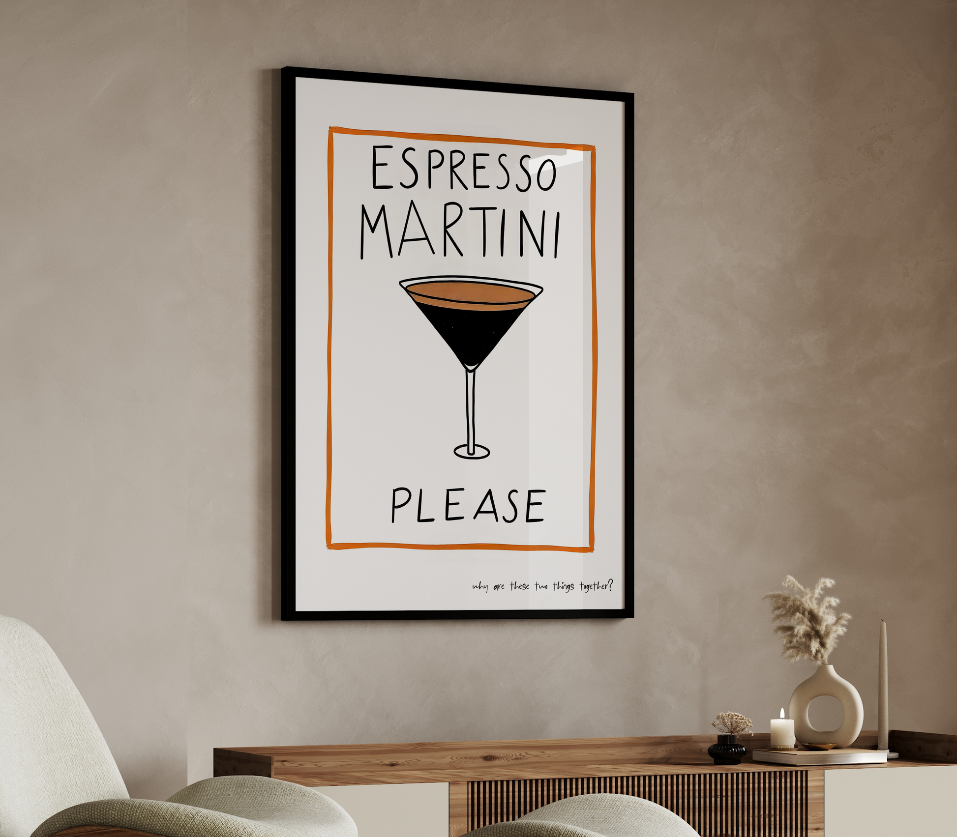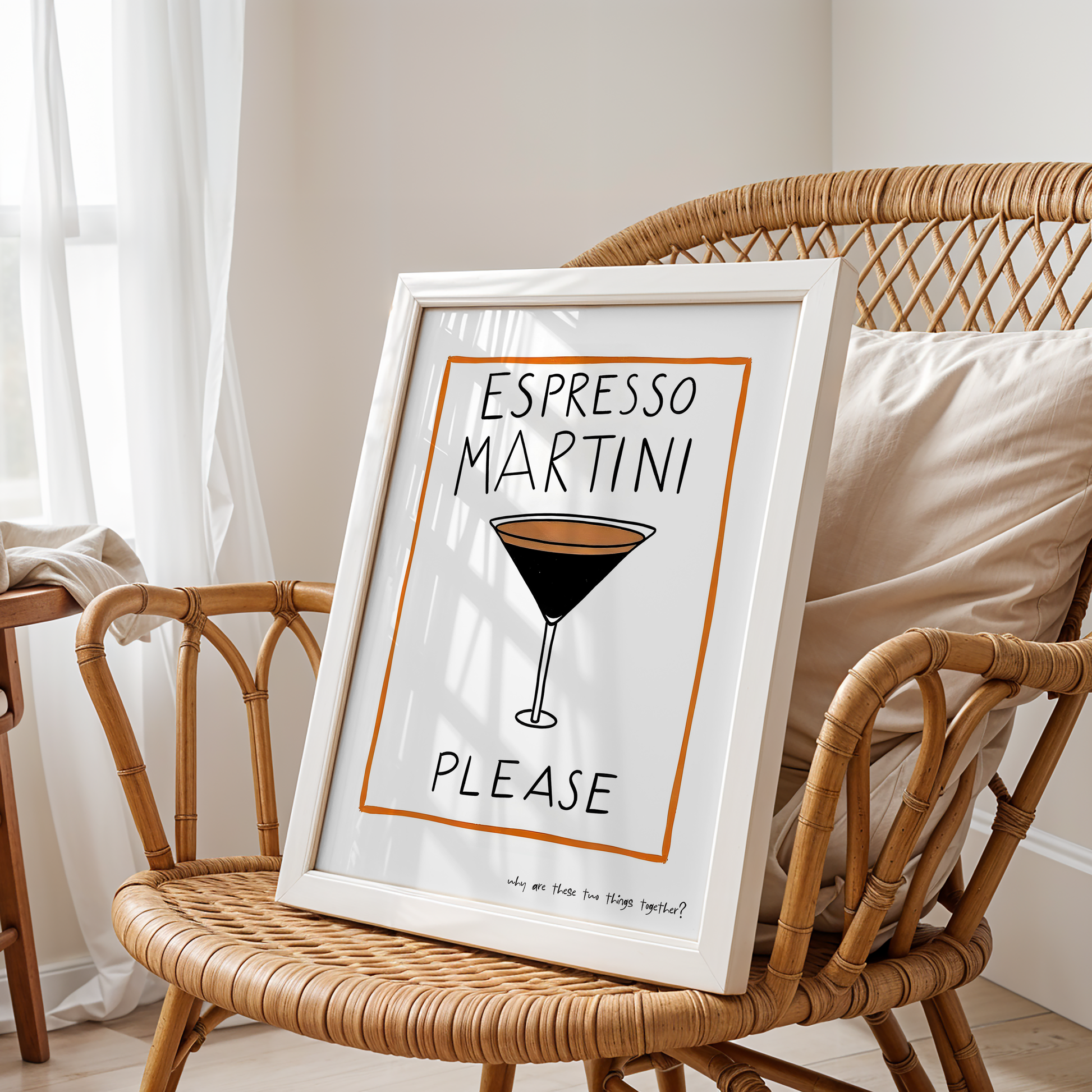 For those who want to be both wide awake and just a little tipsy, "Why Are These Two Things Together? Espresso Martini Please" is the answer. This witty, minimalist poster from the Dopamine Gallery collection features a hand-drawn espresso martini behind playful, pleading lettering—capturing the caffeinated cocktail connoisseur’s eternal dilemma. Perfect for kitchens, bars, coffee corners, or anywhere you need a lift (and a laugh), this print is a conversation starter that celebrates the quirks of modern mixology. Why, indeed? Because life’s better shaken—and stirred!