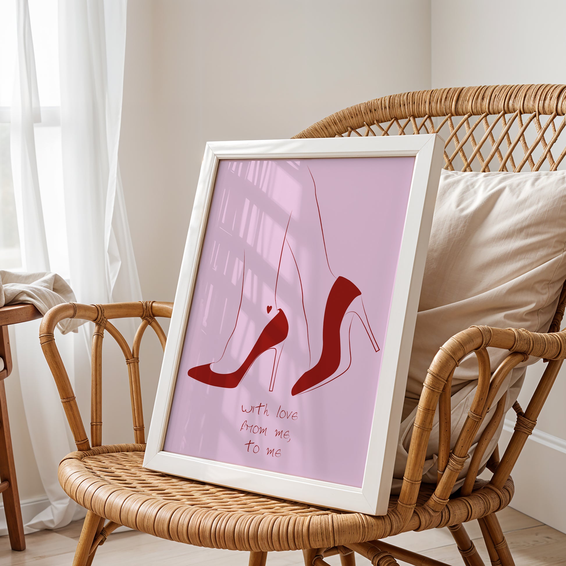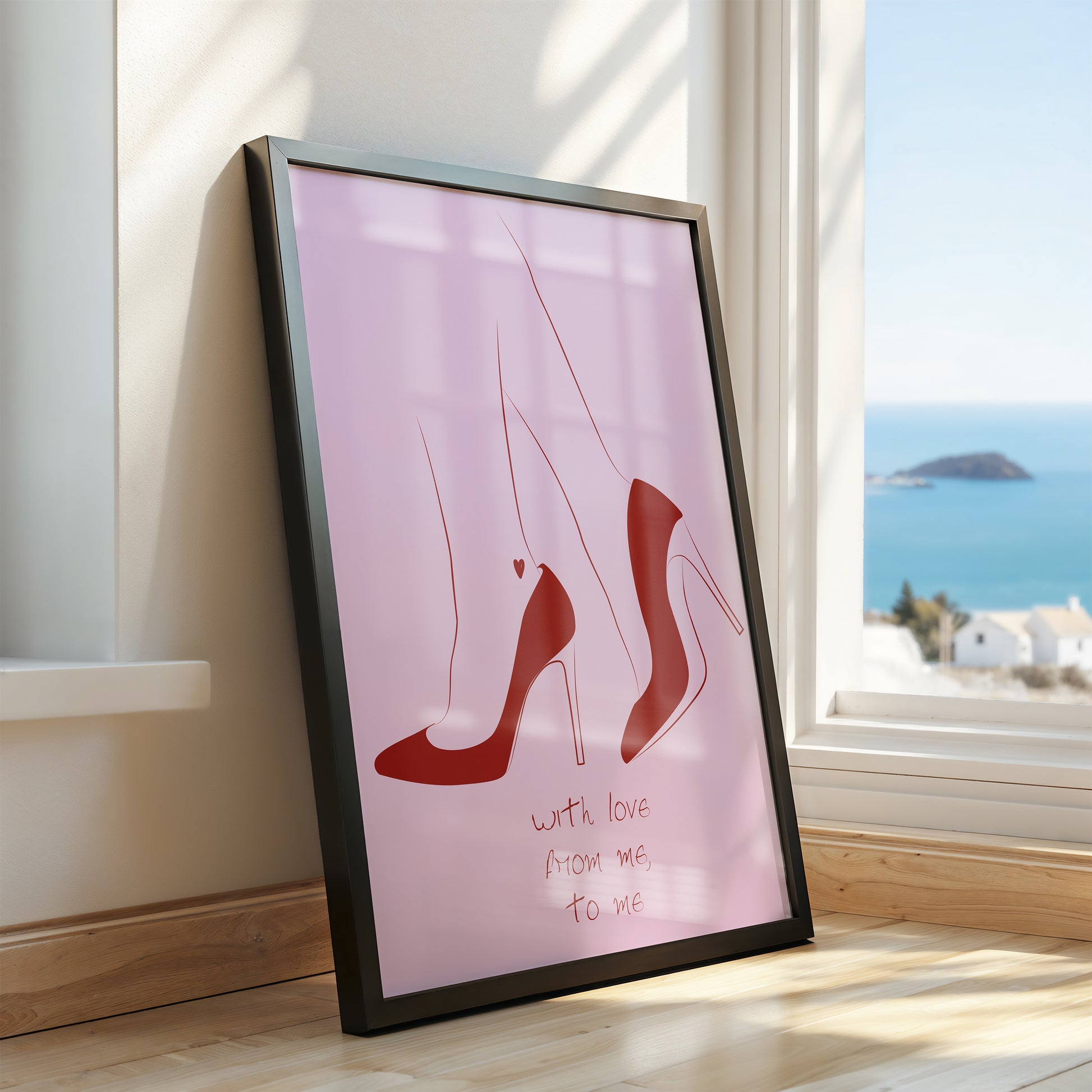 Consider this your official permission slip to spoil yourself. This chic and empowering art print is a tribute to self-love, independence, and the joy of treating yourself. Featuring a minimalist illustration of a pair of fabulous red heels, it’s a stylish reminder that the most important love story is the one you have with yourself.